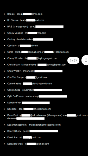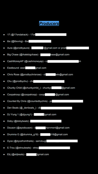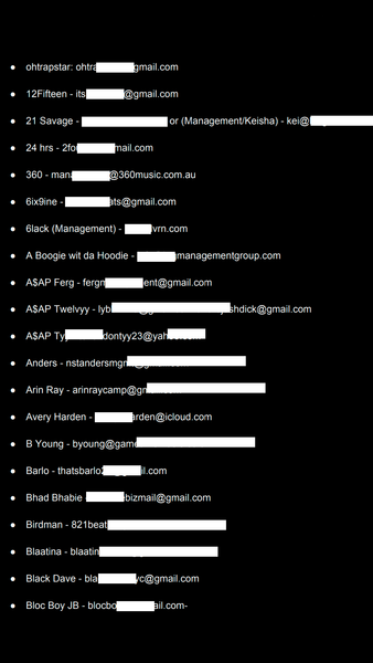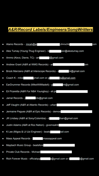 Gain Access to our list with over 500 emails of Rappers, Producers, and Record Label A&Rs separated between categories and listed as Name - Email to keep everything organized.
